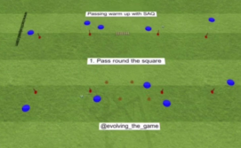 Los jugadores pasan y se mueven alrededor del cuadrado de conos, realizando pases y ejercicios de coordinación.