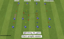estación 2 - el jugador zigzaguea a través de los postes y luego recibe el pase del alimentador - juega 1-2 toques Estación 3: el jugador salta sobre obstáculos (pies juntos) recibe un pase del compañeros, controla con el muslo y retrocede.