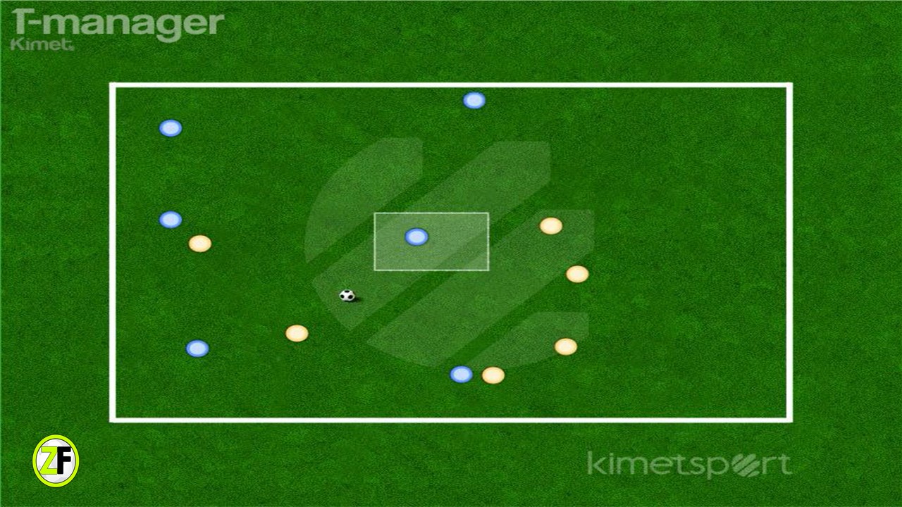 Tarea que se desarrolla en un espacio rectangular de 20 x 40 metros, y en el cual colocamos un subespacio cuadrado de 4×4 metros. Dentro del espacio rectangular jugamos un 6vs6