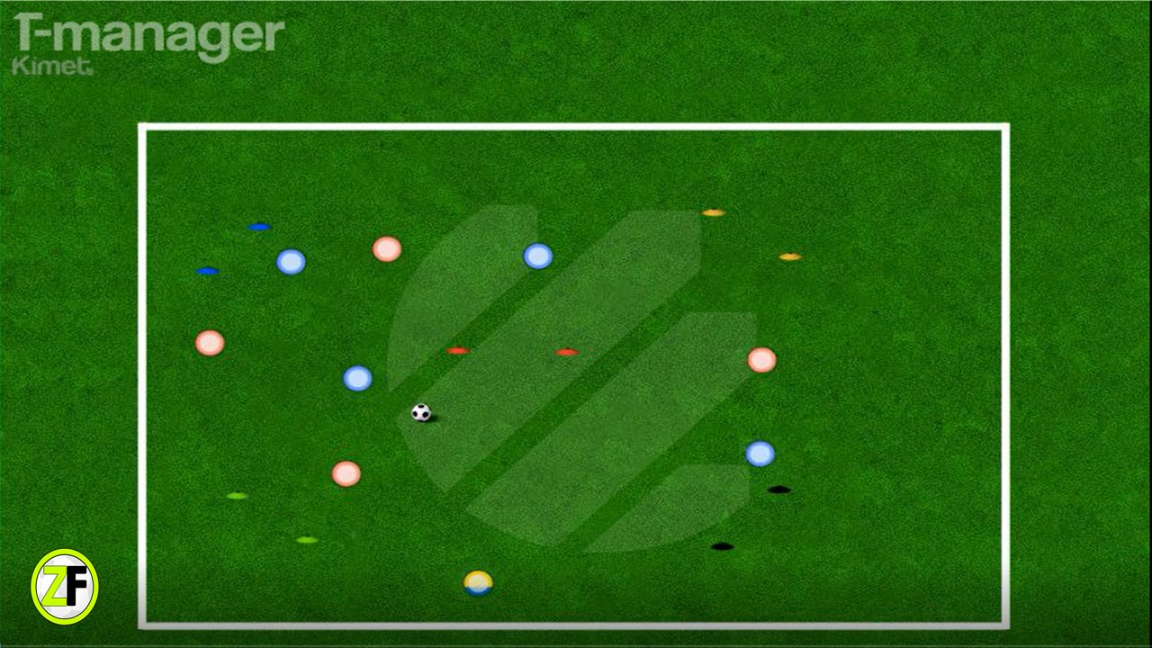 El objetivo de la tarea es mantener la posesión de la pelota y buscar un pase a un compañero entre las porterías pequeñas y que este comunique con un 3ero