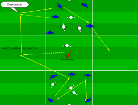 En un rondo, dividido según gráfico,8×8 mt cada cuadro. Se jugará según grafico 5×3 y 5×3 en zonas superior e inferior, en el del medio habrá 1×1. los apoyos del comodín deben ser desmarques laterales, solo podrá realizar el movimiento hasta que se busque progresar después de un límite de pases, al rondo contario.