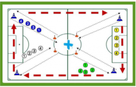 DESCRIPCIÓN: Cuatro grupos de 4 o 5 jugadores corren el circuito trazado intercalando una carrera a velocidad de un 75% desde el cono situado en cada esquina del campo hasta el centro del campo y también la vuelta y realizando una carrera al 50% en los los laterales del campo hasta la siguiente posta.