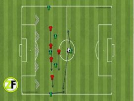 En un espacio de 55x 30 metros colocamos 10 porterías pequeñas. Las ponemos de tal forma que ocupen los 5 carriles imaginarios de progresión. En cada carril colocamos 2, una orientada para un lado y la otra orientada para el otro lado.